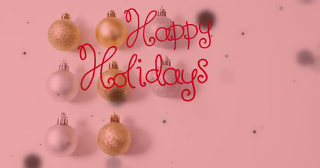 Displaying text reading Happy Holidays on pink surface with fir branches, gold baubles, candy cane. Festive, celebration, seasonal, decorative, elegant, luxury, joyful