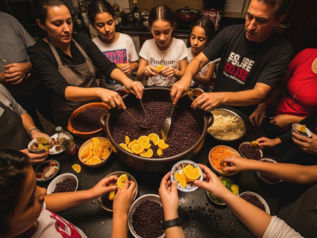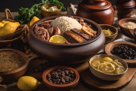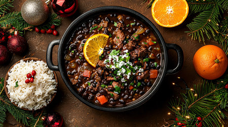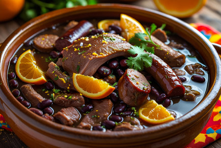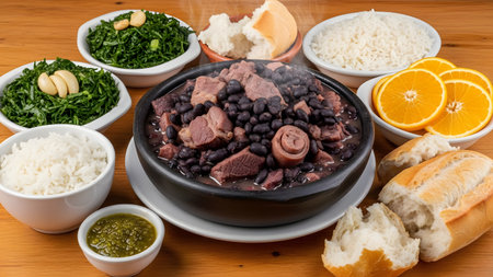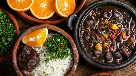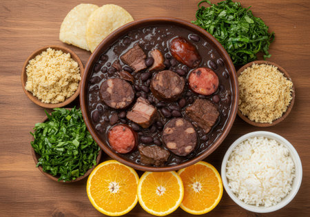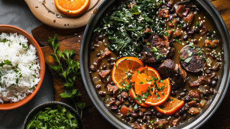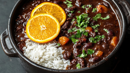 Authentic Brazilian feijoada, a traditional stew made with a variety of meats and beans, served in a cast-iron pot and accompanied by fragrant rice, refreshing oranges, and crunchy texture of farofa