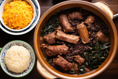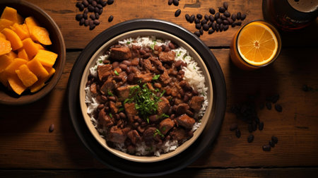overhead shot of feijoada served with crispy pork rinds, created with generative ai