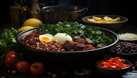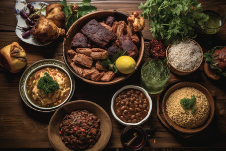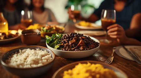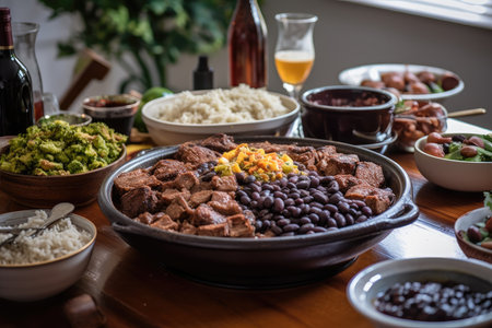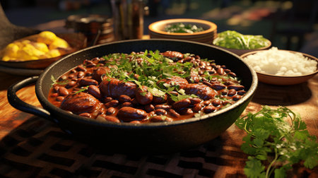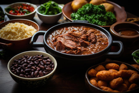Traditional Brazilian feijoada on a rustic table., generative AI