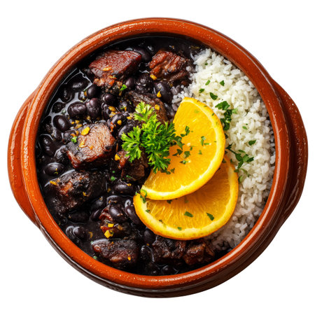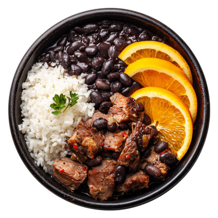 Traditional Brazilian feijoada dish with rice, black beans, beef chunks, stew pork and fresh orange slices in bowl isolated on white transparent background
