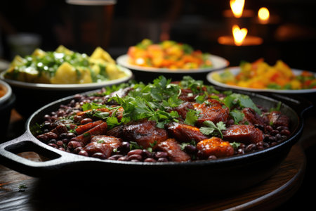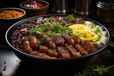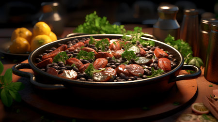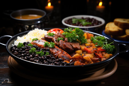 Typical dish of Brazilian cuisine called feijoada, with black beans, bacon, sausag, generative IA