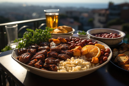 Feijoada at a Sunday lunch on a balcony overlooking the coast of Rio de Janeiro., generative IA