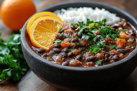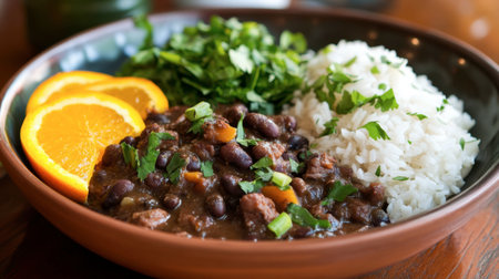 A hearty black bean dish garnished with fresh orange slices and cilantro, served alongside fluffy rice. Perfect for health-conscious food lovers.