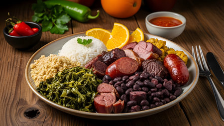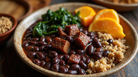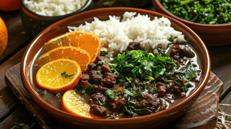 A large features bowl traditional feijoada with black beans, pork, sauteed greens, and orange slices, highlighting Brazilian culinary culture.