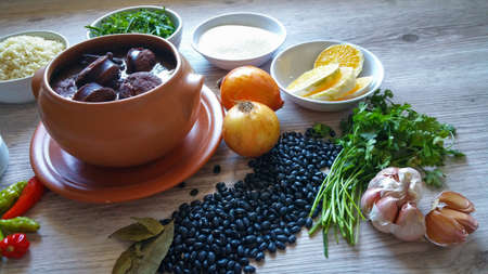Brazilian Feijoada Food. Top view, South American cuisine. Food design. Ingredients and bowl.