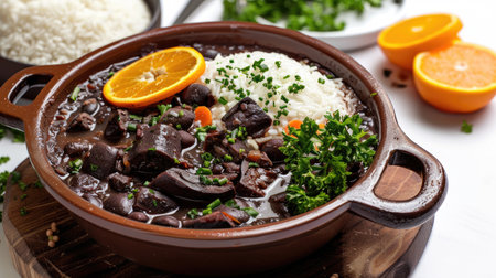 A rich and savory Brazilian feijoada stew, featuring tender meats and black beans, is presented in a rustic clay bowl. Garnished with vibrant orange slices and fresh parsley.