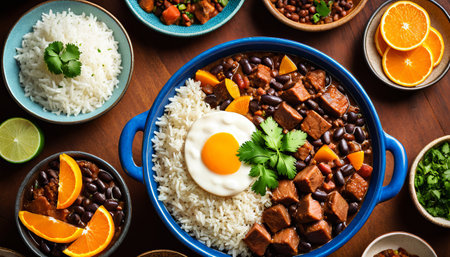 Brazilian feijoada with rice, egg, and citrus garnish in vibrant rustic setting.