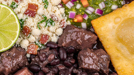 A close-up view of a hearty meal featuring black beans with meat, farofa, and a golden fried pastel. A slice of lime and fresh salsa vinaigrette add color to this traditional Brazilian cuisine.