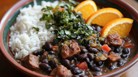 A rich and flavorful Brazilian feijoada with black beans, pork, and sausages, served with rice, collard greens, and orange slices