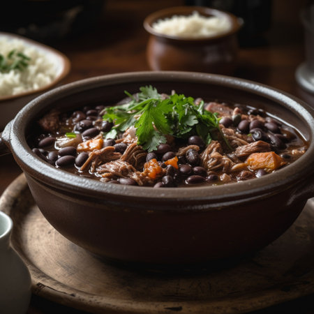 A hearty serving of Brazilian feijoada stew, accompanied by fluffy white rice,