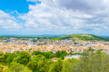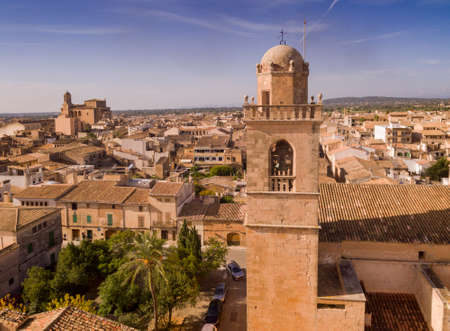 view over beautiful mediterranean village of Arta - Parish Church of the Transfiguration of the Lord on the right - Mallorca, Spain