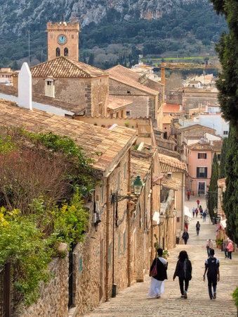 Pollensa, Mallorca, Spain - May 24, 2015: Narrow winding streets in historical town part of Pollensa with traditional stone houses, souvenir shops and medieval church, in Majorca island