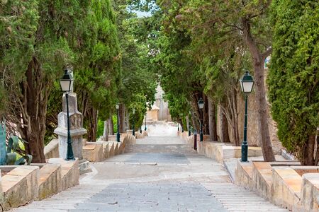 Staircase steps with trees alley to the calvary of pilgrimage church in Arta, Mallorca, Spain