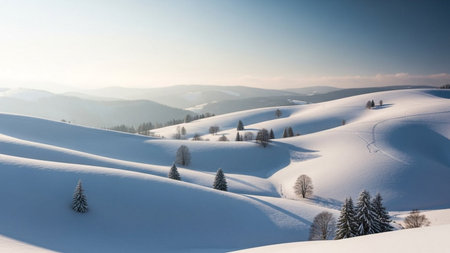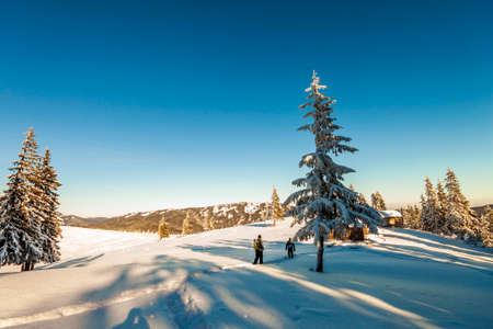 Sunshine under the winter calm mountain landscape with beautiful fir trees on slope at Feldberg Mountain in Hesse, Germany