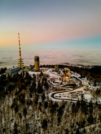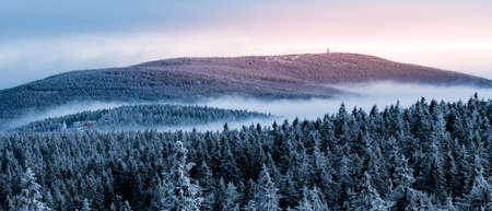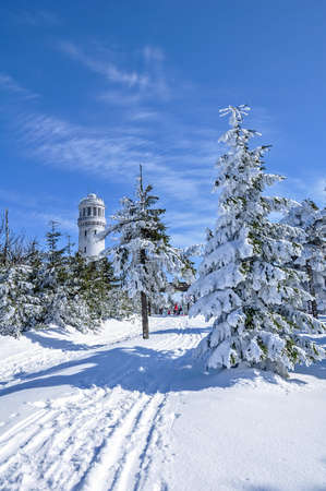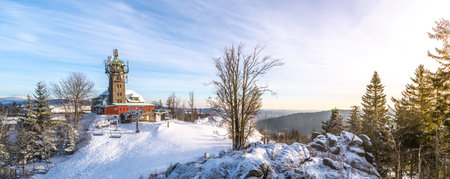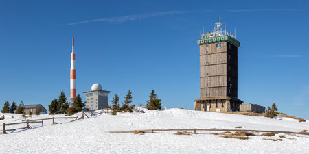 Brocken mountain peak top in Harz with snow in winter panorama in Germany