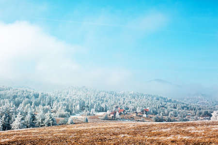 winter scenery of the evergreen forest on the mountain, Zakopane, Poland. High quality photo