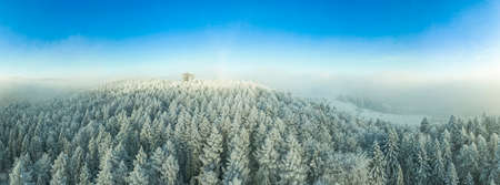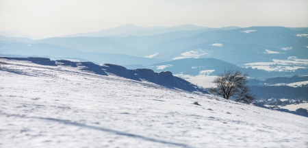 Winter landscape in the Polish mountains of the Sudetes, a view of the snow-capped mountain peaks, an observation tower on the top of Snieznik.