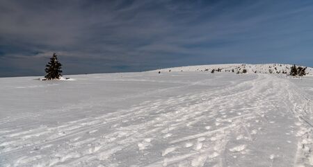 View of winter landscape with fields downhill over snowy spruce tree forest with snow covered conifers. Krkonose Mountains, Czech Republic, cloudy day