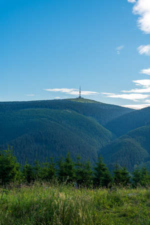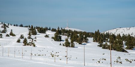 view to Praded hill with communication tower from hiking trail bellow Pecny hill in Jeseniky mountains in Czech republic during nice winter day with clear sky