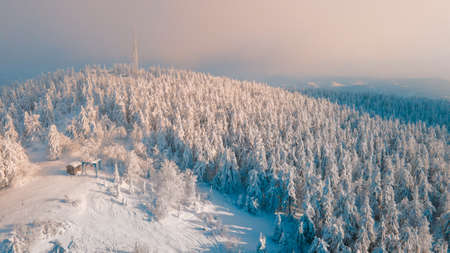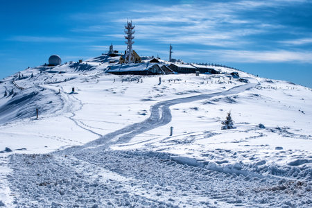 Frozen winter landscape with weather station on a snowy mountain. Kopaonik, Serbia