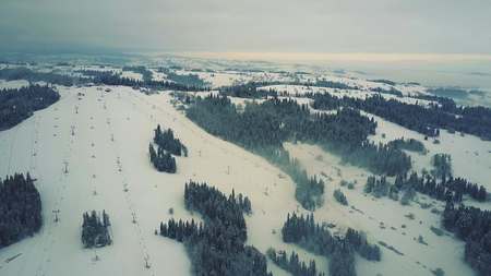 Aerial view of a snow covered alpine skiing slopes in winter. Ski resort in southern Poland, the Tatra mountains