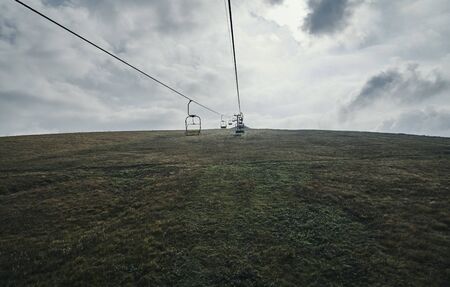 A beautiful shot of cable cars above the snowy hill near trees under a cloudy sky