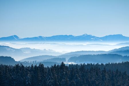 A view from the Orlica observation tower to the mountains with a snow-covered forest and an incoming fog. The vast forest on the hills is covered with a thin layer of snow. View on a cloudy winter day.