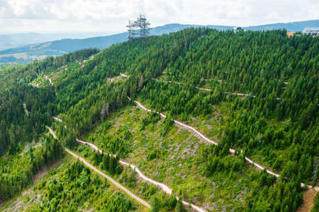 Asphalt road leading to TV transmitter and lookout tower on the summit of Praded Mountain, Hruby Jesenik, Czech Republic.