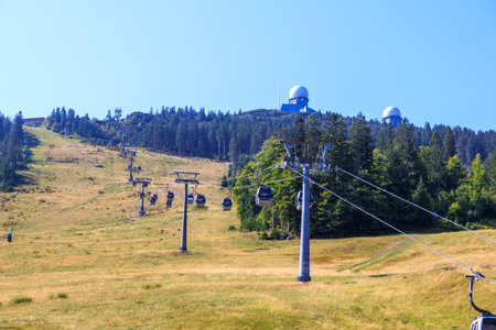 Gondola lift (cable car) to mountain Grosser Arber with radar domes (radome) in Bavarian Forest, Germany