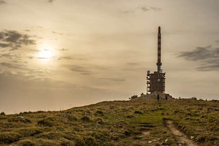 The TV relay tower at Snezhanka Peak rises over a green meadow as the summer sun sets down