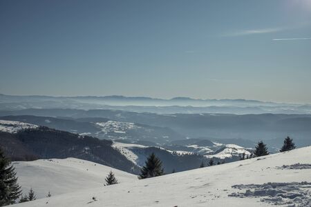 view from Lysa hora hill in winter Moravskoslezske Beskydy mountains in Czech republic with many hills, frozen trees and clear sky