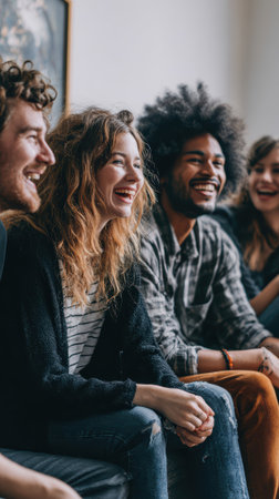 Diverse group of happy young people laughing together on couch in bright interior, showing genuine friendship, joy and positive social connection among millennials.