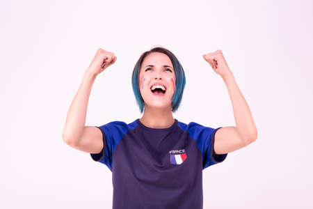 Artwork magazine picture of happy funny man photo rising fists pinned memories isolated painted beige background
