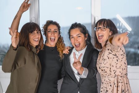 Session young entrepreneurs in the office, 3 young Caucasian women and a young Latina very happy for the return to work