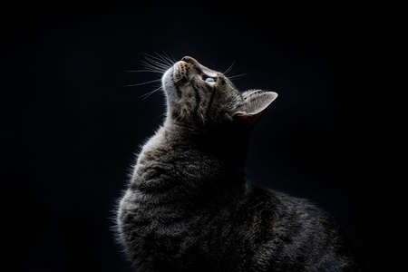 Close-up of striped gray stray cat looking up on a black background