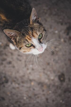 Colorful cat standing on concrete and looking up towards camera. Black, white and orange cat