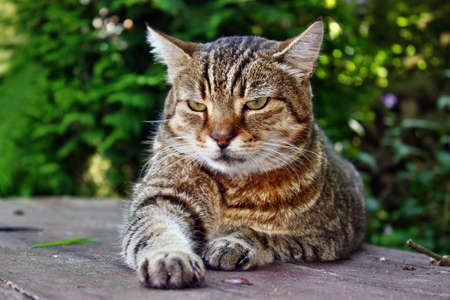 Tabby cat lying by the fence, looking into the distance. The cat is irradiated with rays of light. He looks calm, but has pricked ears