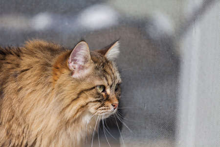 Cute gray fluffy cat by the window. Pets, purebred cats, nature protection. Blurred background outside the window