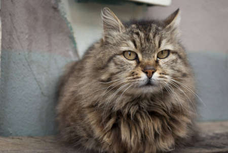 Portrait of cute cat with focus on eyes of gray orange and black colors posing at the camera on the ground on the evening time. Pet outdoor close up concept with copy space