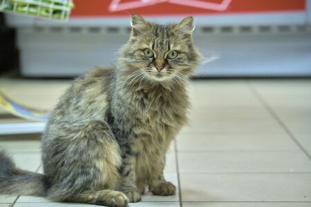 Siberian cat sitting on the floor. Portrait of a cat with a small depth of field