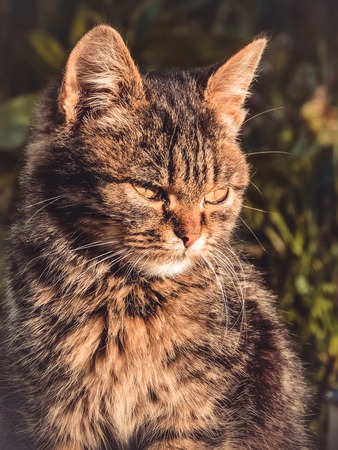 Close-up Of Cat Looking Away. Head from tabby Cat in the nature.