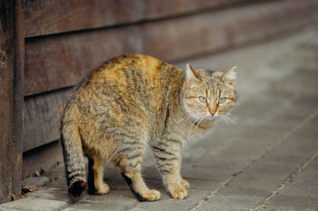 Portrait of cute cat with focus on eyes of gray orange and black colors posing and looks at the camera on the ground on the evening time. Pet outdoor close up concept with copy space