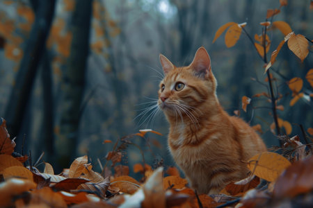 Curious ginger cat sits among fallen leaves in a serene, misty autumn forest