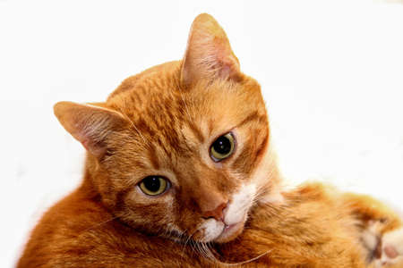 Red cat on a white background. Portrait of a ginger cat.