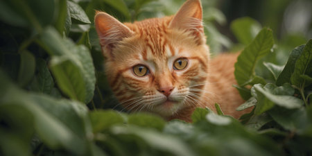 AI Generated. Playful Orange Tabby Kitten Peeking from Behind Green Leaves