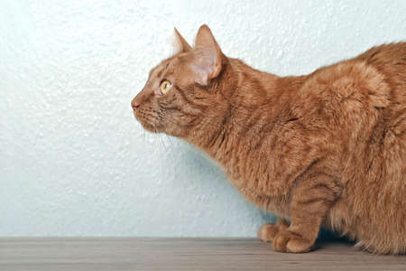 The red cat looks away with concentration. Isolated animal.