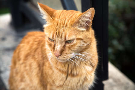 Big homeless red cat portrait. Abandoned old animal sits outdoors in the street and looks to the left. Lost domestic orange pet. Hungry and sad. Animal adoption concept. Feelings and emotions