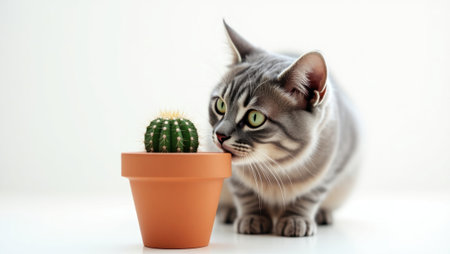 Gray tabby cat with green eyes closely examining a small round cactus in a terracotta pot. Minimalist white background enhances the focus on the subjects.