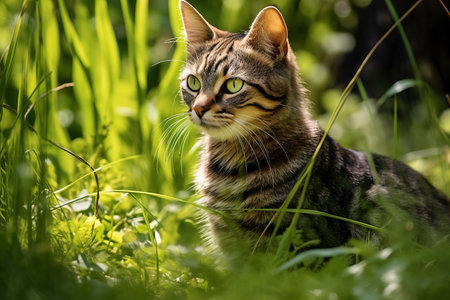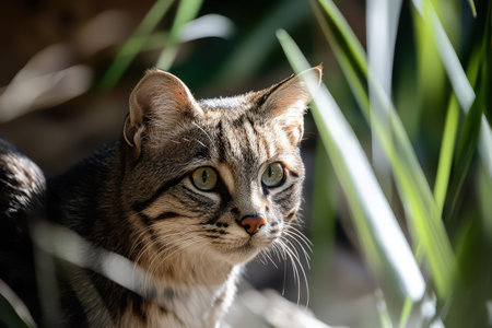 A small wild cat observes its surroundings from a spot among tall green plants on a sunny day showcasing its curious expression.